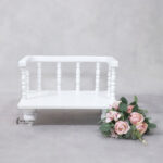 Add a touch of timeless charm to your baby photoshoots with this beautifully crafted white wooden bench. Designed with delicate spindle detailing and a smooth matte finish, this prop creates a soft, elegant backdrop perfect for capturing precious moments.